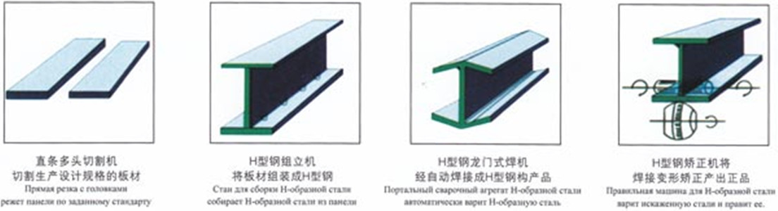 輕型H型鋼的生產(chǎn)工藝過程為: 直條切割——型鋼組立——龍門焊接——翼緣板矯正——小件制作及筋板焊接——〔三維鉆孔——拋丸除銹——噴漆涂裝〕。